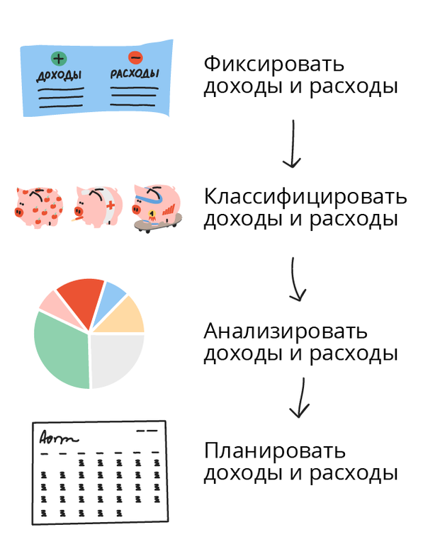 С чего начать, если вы раньше никогда не вели личный бюджет? Шаг первый: просто начните фиксировать доходы и расходы, пусть даже без классификаций. На данном этапе главное – не бросать. Когда это войдет в привычку, вы сможете сделать следующий шаг – классифицировать доходы и расходы, потом заняться их анализом. А дальше – высший пилотаж: составление бюджета на будущее, то есть финансовое планирование.
