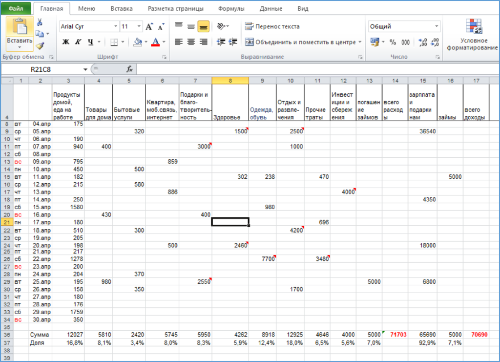 Также рекомендуем сделать элементарное представление отдельных категорий расходов в процентах, чтобы удобнее было сопоставлять их между собой. Данные за другие месяцы располагаются на соседних вкладках, сделанных по тому же шаблону.