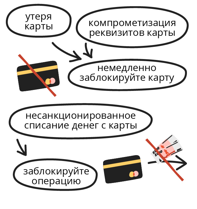 Что делать, если вы понимаете, что есть угроза мошеннических действий по вашему счету, а именно: