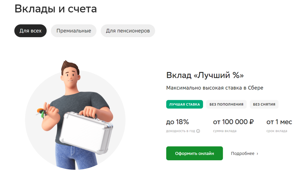 Ниже приводится скриншот линейки срочных вкладов Сбербанка (по состоянию на 1 июля 2024 года).